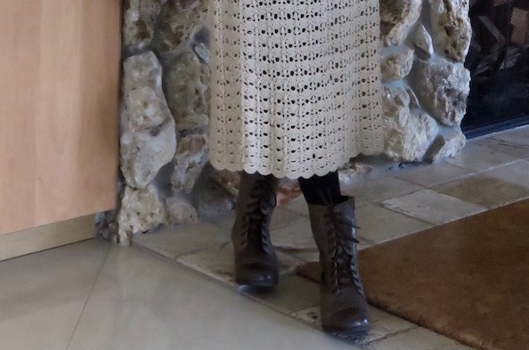 Today it was cool enough outside to do the crochet skirt, black leggings (similar), a black layering tee (sim) and a thrifted Talbot’s cotton sweater (sim). And of course some funky boots – these are by Steve Madden. They have a side zipper so I don’t have to lace up every time, lazy dresser that I am. A thrifted bird pendant (sim) is my only jewelry, as it makes its own statement.