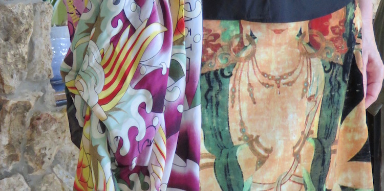 I absolutely love the pairing of the scarf with your Goddess skirt. They work wonderfully together even though the two prints are different the color palette is the same and you were wise enough to ground them with your beautiful black sweater. Lovely outfit. I knew right when I saw your necklace that it just had to be one of our dear friends, Suzanne’s creations, it a magificent piece of art.
