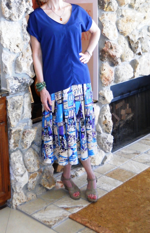 The Ideology print skirt is adorable. The Old Navy silky top is a lovely sapphire color and it drapes nicely. I like the nude sandals just fine. And the green wooden bracelet is newly purchased from Bella’s Etsy shop, so guaranteed cool.