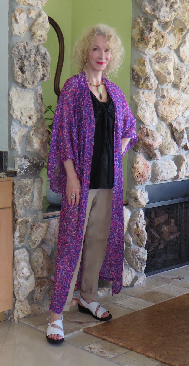 And newly thrifted white sandals (sim) – I am on the fence about them. Here they almost scream out: “I’m an older woman!” But in other wearings, they look cool.