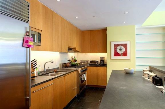 Our new cabinets will be slab maple in a honey stain, something like this. Our granite counter-tops are staying, even though I just read that granite is over, out, done! Too pricey to replace them.