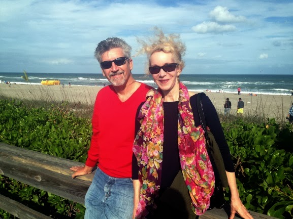 All our activities were casual, and no dressing up was required. Sandy wore a bright red sweater, and I was neutral in a navy sweater with black knit skirt, plus crazy-color scarf. The temp was about 72 degrees, with a brisk wind and picture-book sky. This pic was taken at the boardwalk about a half-mile from our house.