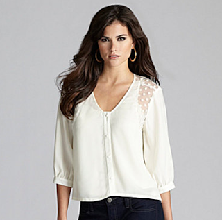 As we browsed through the racks of clothing at Dillards, it was fun to observe our different personal styles at work. Paula loves “neon brights” and gravitates to color, color, color. She’s an artist and has a great eye for combining colors and patterns. I was drawn to more muted pieces, but there were several items we both reached for, like a gorgeous feminine blouse: