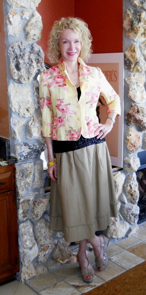 Florals are huge again, and I like mixing them into my wardrobe. Five years ago, B.B. (before blogs), I would have worn this khaki skirt and cropped floral blazer with a nice, matching top in ivory or soft pink. Nothing illegal about that.