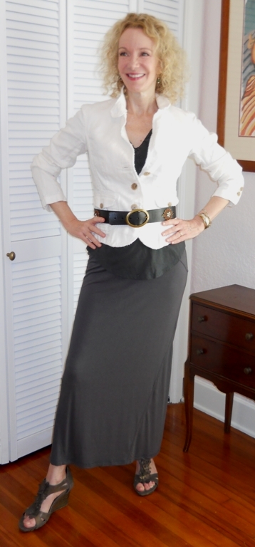 The creative and fun part of the wardrobe challenge is remixing. Today I am recycling my off-white cotton jacket with a familiar knit maxi. Underneath is a simple ruffled tee that’s almost the same shade as the skirt. So I’m monochromatic again, but I don’t mind. Somehow it feels cooler, temperature-wise.