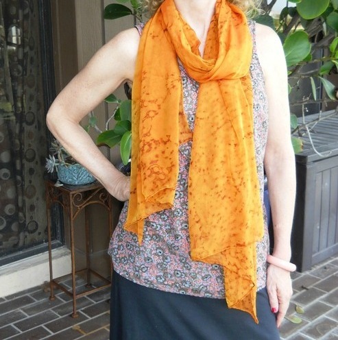 Anyway, the kind people at Camilla Olson sent me one of their yummy scarves to review, and they choose this fabulous color for me. It’s “Marigold” in their catalog, and the color is so vibrant. The fabric is delicious too: 100% silk, custom printed in Camilla’s California textile studio. No two scarves are exactly alike.