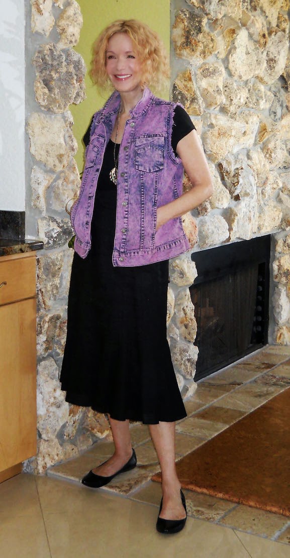 I wear mostly neutrals, with some cobalt and olive as my “colors.” Today I forge new territory in a bright purple cut-off denim vest, courtesy of the fabulous Diane Gilman. The frayed sleeves make me feel punky and biker-ish, even though I am every inch a classy broad.