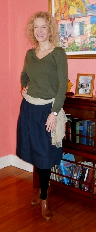 Thanks for playing along. Here’s a simple, cozy outfit I wore today, featuring a pretty lace scarf gifted to me by my mother. The cotton skirt is by Tommy Hilfiger and the booties are by Tsubo. It’s nothing very special, but I really like the feminine vibe of the scarf against the sporty pieces.