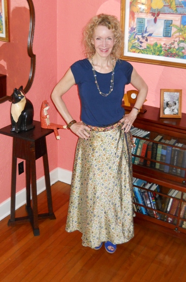 I wore this wrap maxi skirt with the other side out here, and liked it – but I thought the contrast was sharp between the tee and the skirt. Here I’m wearing it opposite-side out, with a softer tee. I like both looks, no strong preference. I haven’t yet tried the skirt-as-sundress that Terri mentioned, but it looks intriguing. Don’t you love hard working clothes?