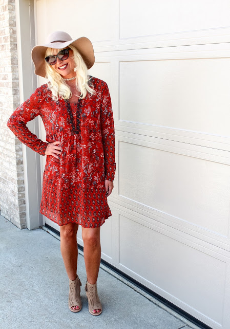 Go Boho, all the way: Andrea of Living On Cloud Nine is Boho fabulous, in a floppy hat, big shades, and a great retro-style print dress. Love those booties too.