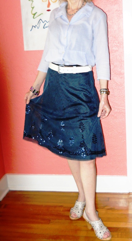 I have nothing profound to say: I just love this Old Navy, navy skirt. It has a net top layer, a swishy underlayer, and sequins! And I wear it to work! Today I added a very soft washed-linen shirt, an off-white belt, and casual studded shoes. Did I mention I love this skirt?