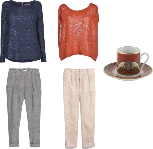 - A sequined sweater with men’s trousers, instead of a skirt.