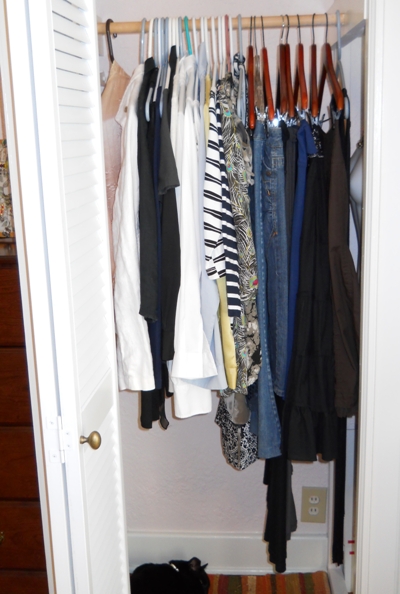 I’m going to use only these clothes for work, for the month of July. King the Cat inserts himself at will. That’s my naked mannequin on the right. Nothing kinky. |