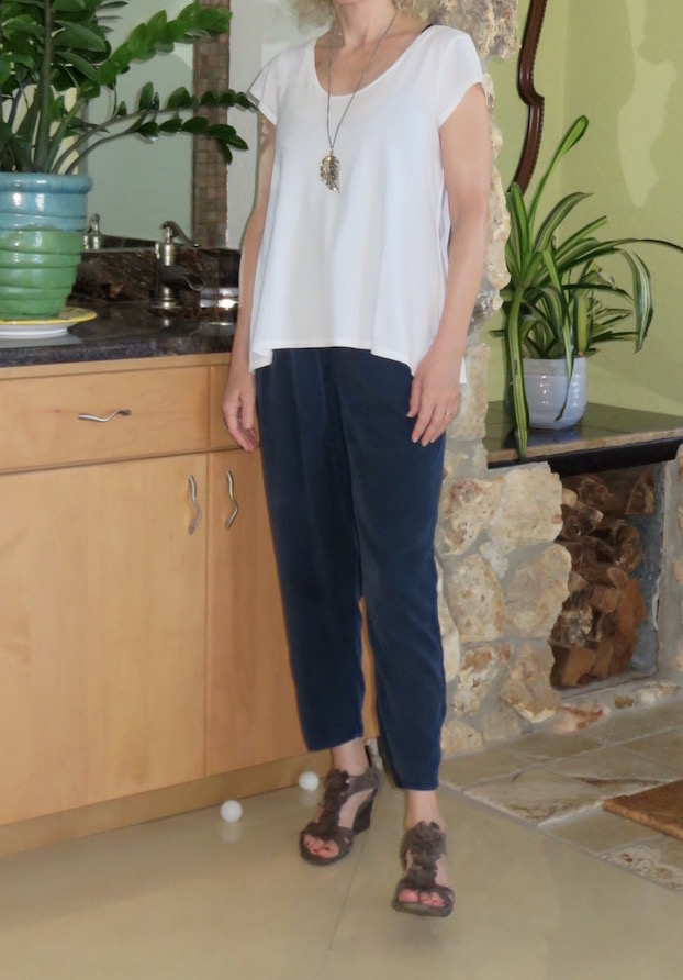 I want to look fresh and modern, even if only for my music lesson and Starbucks. So I rely on easy trousers, like these ill-named “jogger pants.” I have never jogged or even walked quickly in these, but I love the drapey fit. The white tee has a trapeze shape, one that I really enjoy (similar). It’s by Andrea Jovine and I picked it up at the Humane Society Thrift for a couple of dollars. Thrifting forever.