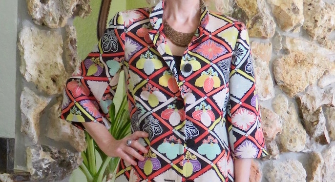 For my contribution, I chose a merry mix of colors and patterns. I am wearing a Karina Rita wrap dress in black and white – Karina dresses are my go-to pieces, always fresh looking and figure-flattering. I topped it with my Trina Turk coat-of-many-colors (similar), purchased via online consignment.