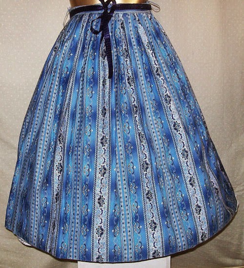 Last week I wore a skirt three times, and was not critiqued, arrested, or accosted in any way. My skirt isn’t this one exactly, but it’s thisclose: a mostly-blue cotton skirt, vintage 1950’s, and very full. It’s a lot of fun to wear.