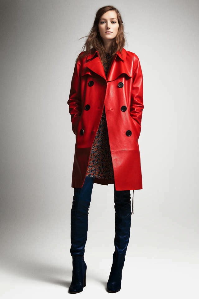 Derek Lam shows a sleek, wide lapel trench coat in crimson leather. |
