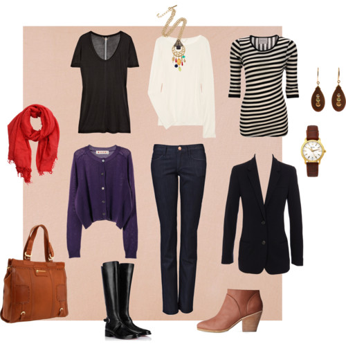 I got fascinated with the idea of a Six Piece Wardrobe earlier this year. This capsule has six actual clothing pieces, but allows plenty of accessories. I appreciate the casual but polished look of these pieces. When I’m in New York I wear a lot more black than here in Florida, and I feel comfortable with it. The red scarf will give me a shot of color, and a fitted black blazer will go with everything. How I wish I owned a spectacular bag like the one shown, but I have a very nice Anne Klein that will do the trick.