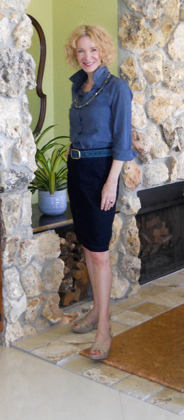 Businesslike and buttoned-up: Chambray shirt (sim), pencil skirt (sim) and wedge sandals (sim). |