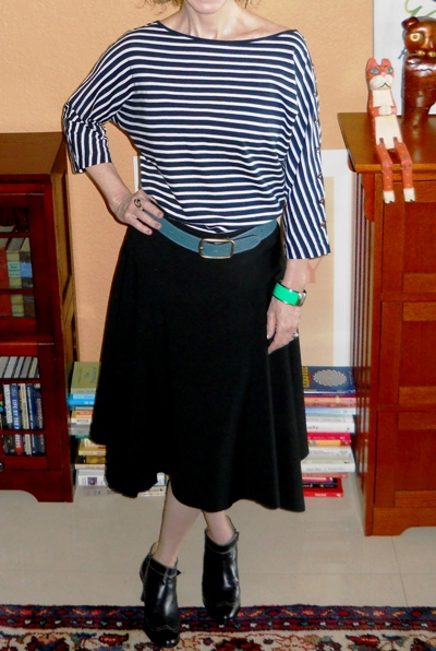 Here’s another quickly-assembled outfit for work days. Behold the clutter! Baby steps. I love the swingy black skirt, thrifted recently and paired with a nautical top, suede belt and bright bangle.