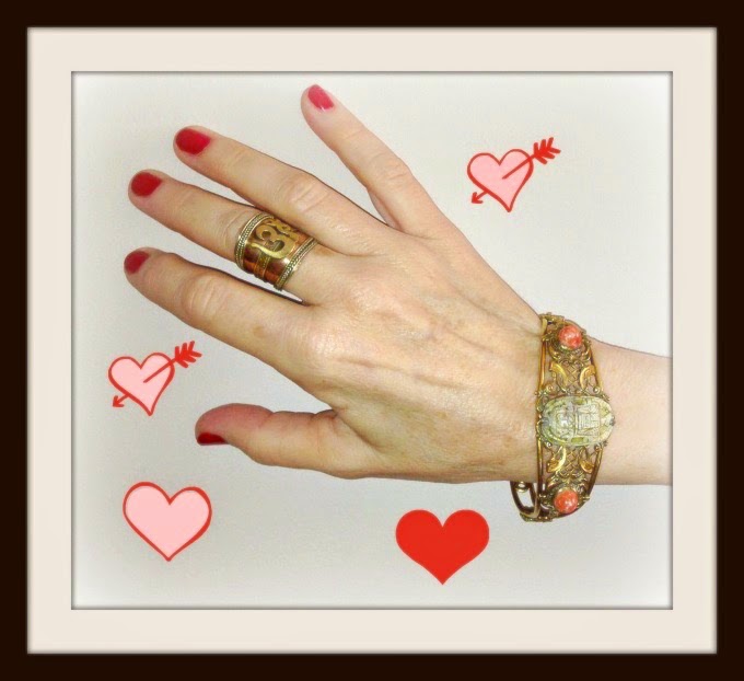 You know I love the vintage Egyptian-style bracelet Sandy bought me for my birthday (from Citizen Rosebud’s Etsy shop – go check out her offerings). So of course I wore it to NYC. But at one of our fabulous lunches, I noticed the scarab had fallen out.