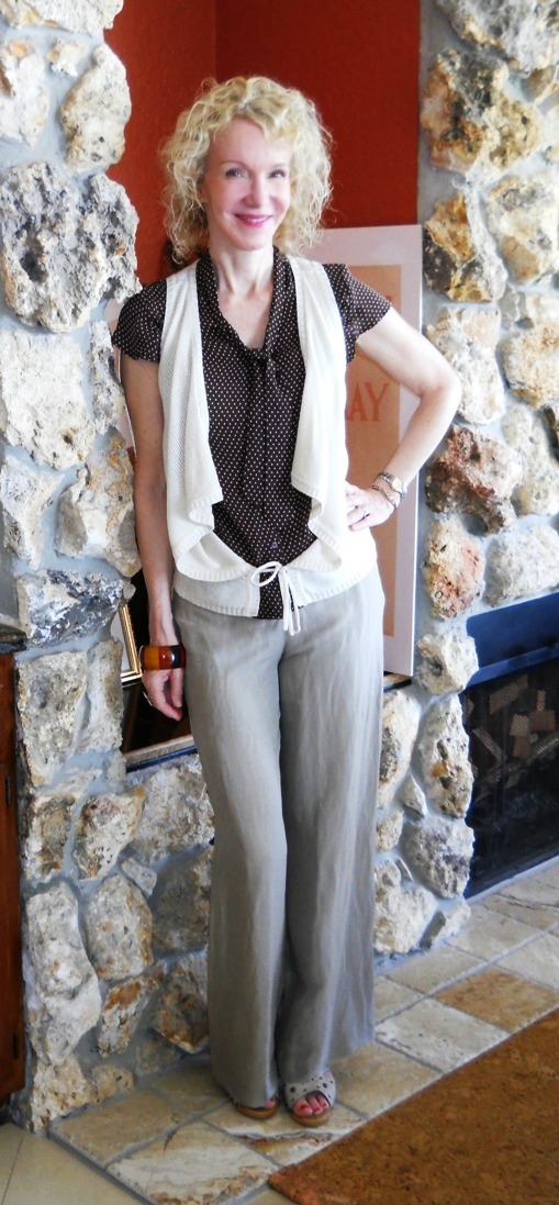 Frugal and completely chic – that's my kind of woman! Love the pants, the flowy vest, and the classic polka dot top – one of my favorite looks for you!