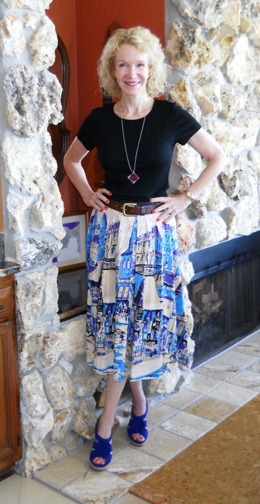 Now that looks wonderful, Patti – the skirt is the star of the show, but the shoes really complement the blue in the skirt, and the tighter top shows off your enviable figure beautifully. Lovely! And thanks so much for hosting, as always you do so with grace and humour. xxxxx