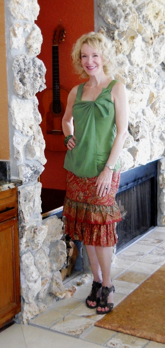 Now Patti, is it me not remembering properly (which is entirely possible, nay likely!) or do you not wear green very often? I don't associate it with you, yet look how fabulously it suits you – must be that eye trick! That's why I wear red so often… Actually my eyes are a sludgy green/hazel/not much of a colour, so I don't think your tip would work for me. Shame. Love the interesting shape and detail of your top, and that skirt is all kinds of flirty, just right for a date night!