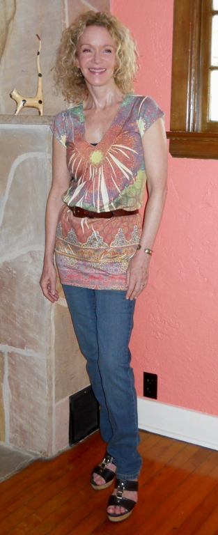 I bought this colorful knit tunic (by Fleurish) at a thrift, and loved the hippie-ish print and the deep vee (needs cami though). It’s got some Visible features – mainly the print and the deep vee! and the body-hugging fit. But that’s what we’re doing here on Visible Monday, owning our age, whatever it is, and dressing in ways that make us feel good. We’re not hiding.