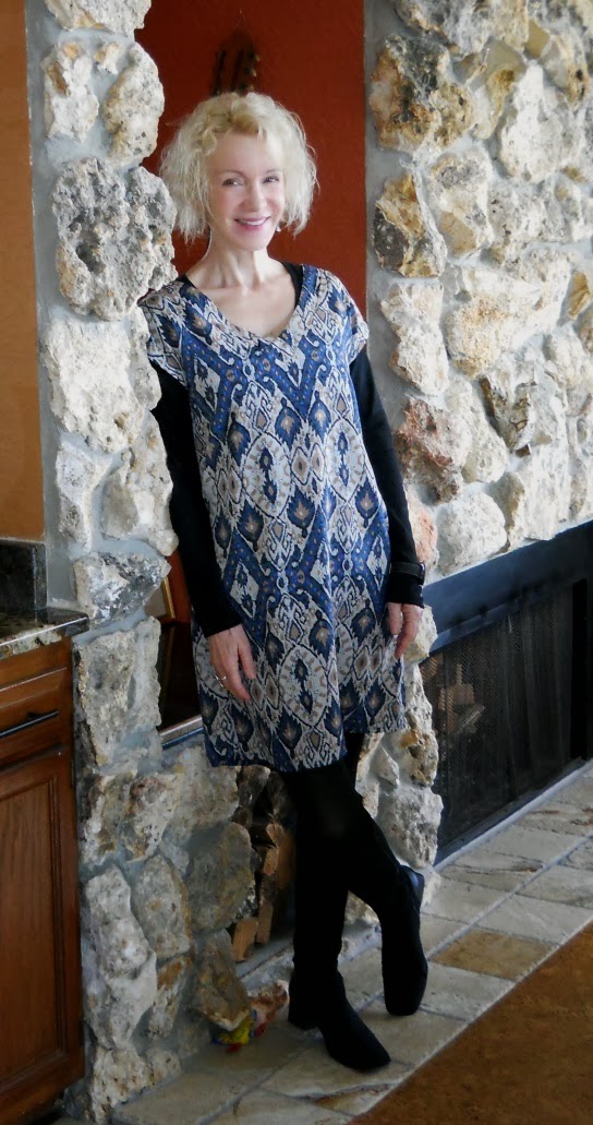 I love the pattern of that tunic, and how effortlessly you've transformed it into a winter outfit with all the dark layering. Looking great dear Patti!