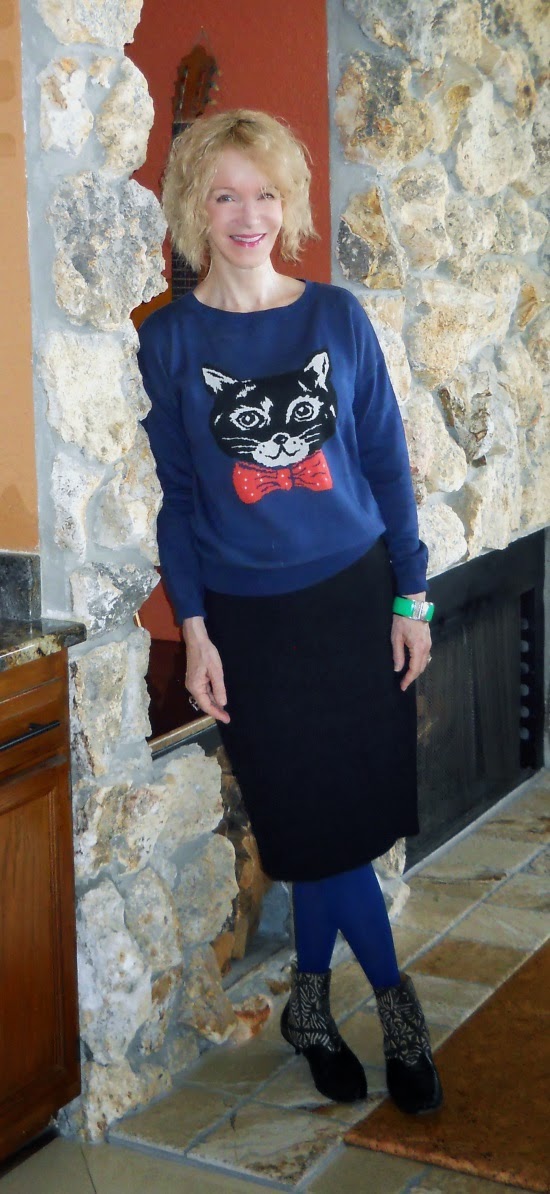 Your cat sweater is adorable, looks great with matching tights! Love the booties, a fun outfit for a fun lady!!