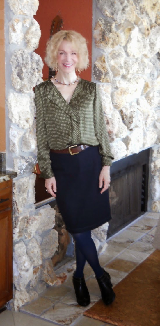 Patti, I love this olive with the cobalt skirt. What a difference a color will make to a blouse, the cobalt just brings out all the vibrant colors and worn with the men's style leather belt is absolutely perfect.