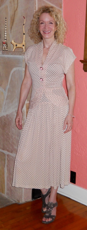 Here is a pale peach 1940’s day dress that I have worn to work and to some social events. Somehow, it has grown smaller over the years, as the ghostly closet re-sizers must have had their way with it! So it will soon go to the consignment shop or up on eBay.