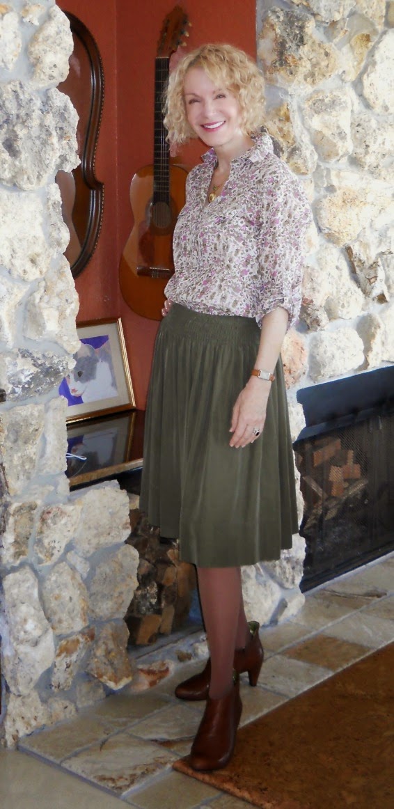 Patti, I find myself gravitating more and more towards those beautiful, soft floral blouses. You are so right, they look wonderful paired with a skirt and just as great with a pair of jeans. You do look wonderful in olive, great color combination. And, so loving your shorter hair.