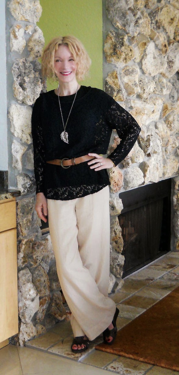 Well, I beg to differ, I like the belted version! You have such a gorgeous figure, Patti, and I think wearing the belt shows it off. Black lace is always gorgeous, and you really suit those elegant wide-legged trousers.