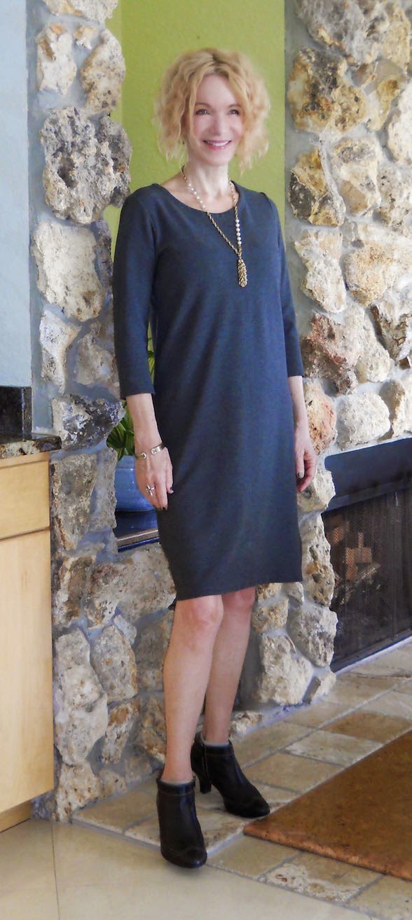 A simple gray dress never lets you down. This knit one (similar) was thrifted in NYC; the label is Uniqlo. I can wear it dressed up for the office like this, or with leggings and my denim jacket.