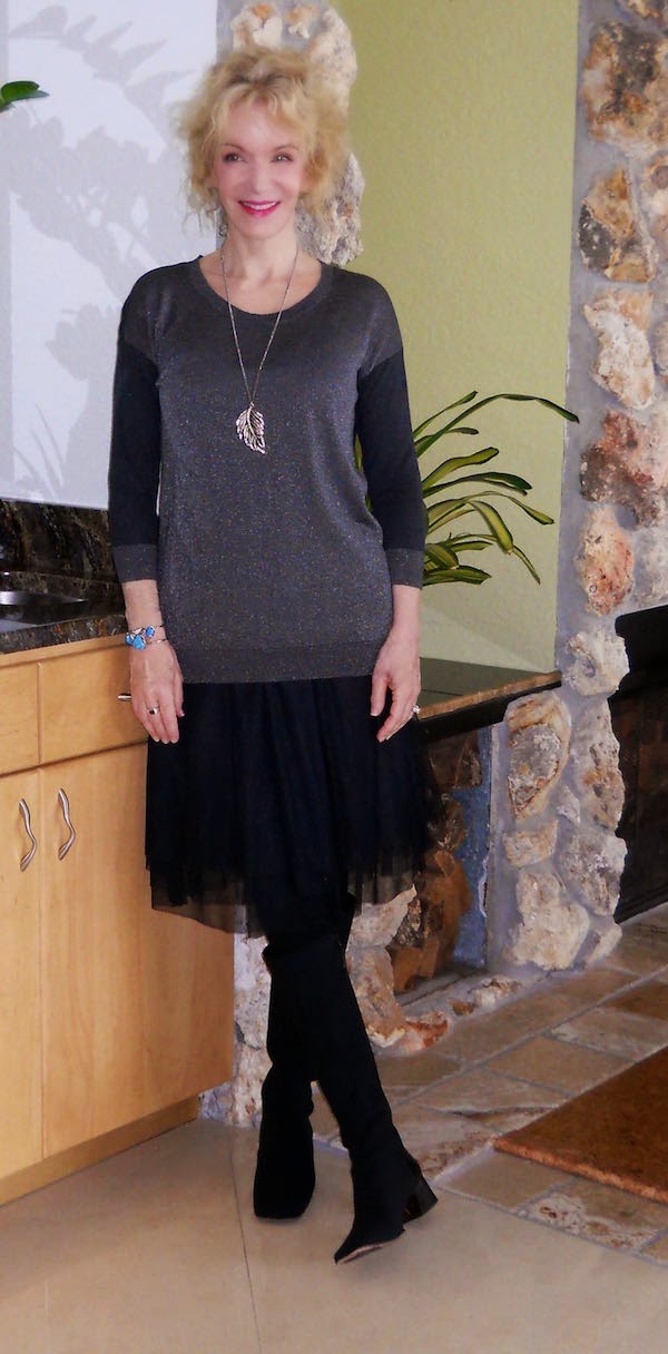 Neutrals again today, but covered with the most colorful coat in my closet. I’m wearing a thrifted multi-media tee (similar) over my beloved Old Navy tulle skirt (sim). A silver leaf pendant and stone bracelet (sim) add some twinkle. And my brag-about Donald J. Pliner boots (NYC thrift shop, $20, OK shut up now Patti).