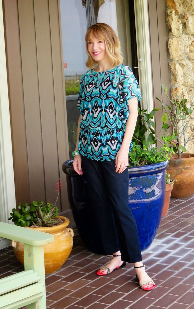 It was hard to give up our lush cottage garden when we moved to the condo. But we have a few pots and oh yeah, there is the Atlantic Ocean across the street. So no sads for us. I feel pretty terrific today in this colorful tunic over my easy cotton boyfriend trousers. And my new hair.