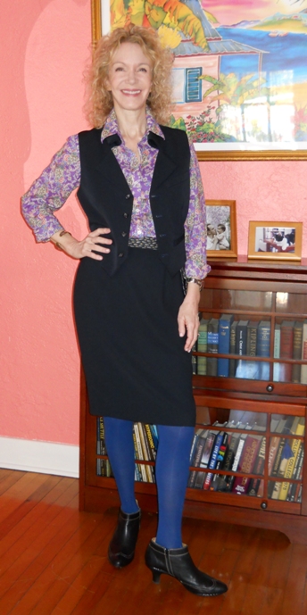 To avoid a too-corporate look, I added blue tights, booties, and my husband’s tie as a belt. He has sworn off ties forever, so I have free rein of his collection. I like the resulting almost-suit — not too stiff, but doing justice to the finely tailored vest. I’ll wear the vest in the future with my jeans, and with more feminine, floral skirts in the spring.