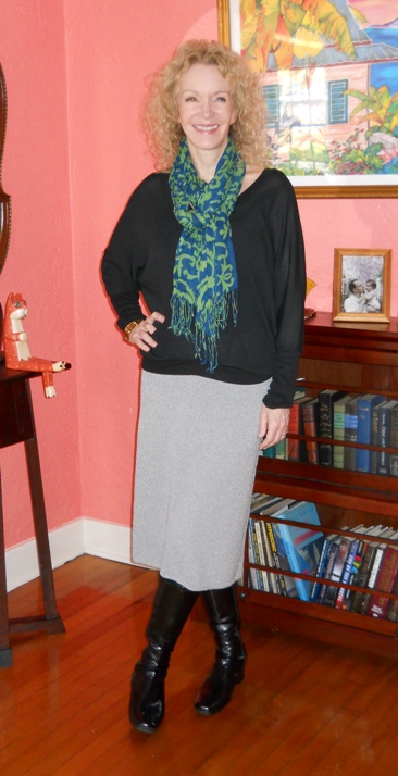 I see from my pictures that I am breaking the “rules” by not showing leg between my slim skirt and my boot-tops. My skirt should be two inches shorter. I could remedy this next time by just rolling at the waist (I know! Just like when we were 16 years old!).