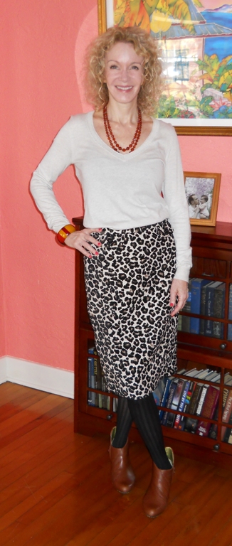This is a “signature” look for me, I think: neutrals, medium size prints and accessories, shoes with some personality, and total comfort. There’s nothing too tight, stiff or stuffy. I’m covered, but my feminine form is still visible. I think a twenty-something or sixty-something can wear these pieces, or a version of them, so I feel like neither mutton nor lamb! : >