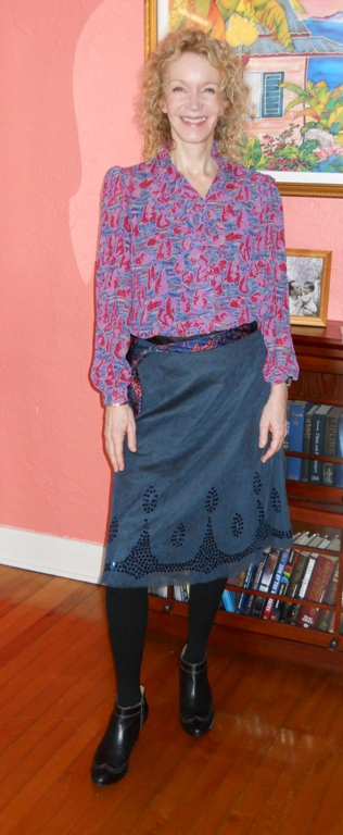 I do adore this Old Navy skirt, thrifted a couple of years ago, and down to about 25 cents per wear. I noticed that one of Sandy’s ties made a lovely almost-fit with the blouse, and he was kind enough to tie it man-style around my waist (that was fun!). Tights and trusty Sofft booties completed the look.
