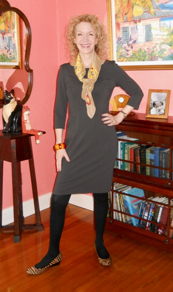 Today I chose a vintage scarf, tied willy-nilly (I need to study those scarf tutorials!) as a colorful accent. My so-cheap bangle bracelet added more color and I wore my new tiger-print flats. I think the overall look is approachable, pulled together and age appropriate. For a more festive occasion, I’d replace the scarf with sparkly necklaces, and the flats with open-toe wedge heels.