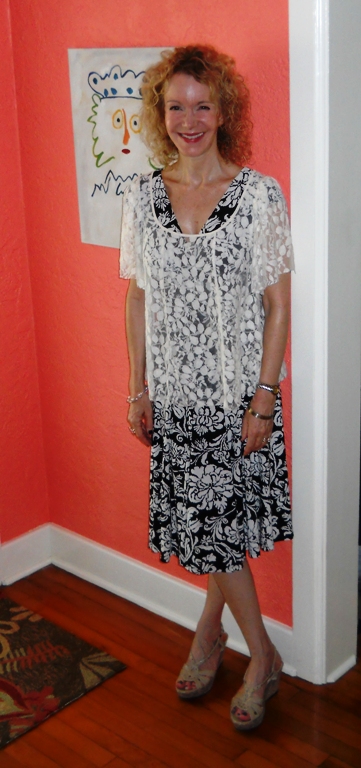 I had so much fun with my lace blouse last week, I decided to go lacy again. This time, I chose a sheer lace topper that I picked up in a NYC consignment shop. I wore it over an easy knit dress by Lauren Ralph Lauren, with nude platform sandals by Anne Klein.