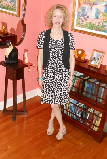 Every aspect of this outfit is beautifully-proportioned on you, Patti – the fit and pattern-scale of the dress, vest, shoes – you look fantastic! Congrats on your a/c repair as well. 🙂