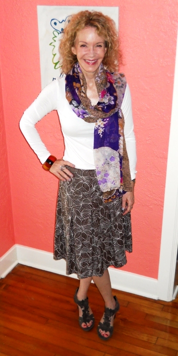 Patti, your scarf is beautiful. I love how the pattern in your skirt picks up your sandal design, as well as the graphics in the scarf. And yes, I am actively putting my scarves into rotation again.