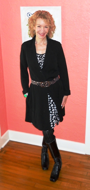 Wow, you look tres chic in that ensemble Patti! Love the tease of dots peaking through the layers. Who knows about the toes? The boots look great!