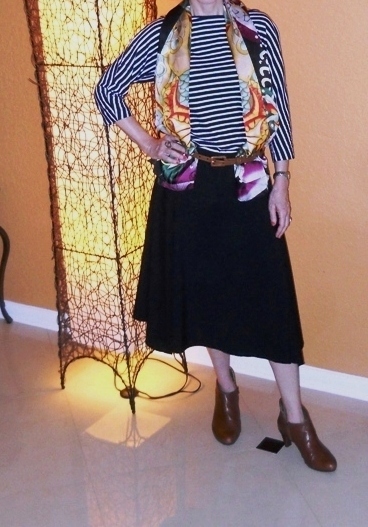 The Breton stripes mix wonderfully with the elaborate pattern of the scarf. No hose! I'm wearing long dresses so that I can wear thermal underwear up here in New England.