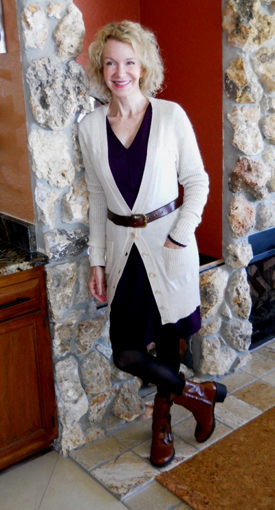 I love the cardigan with the belt showing, and it matches your boots! Go girl, you look fab!
