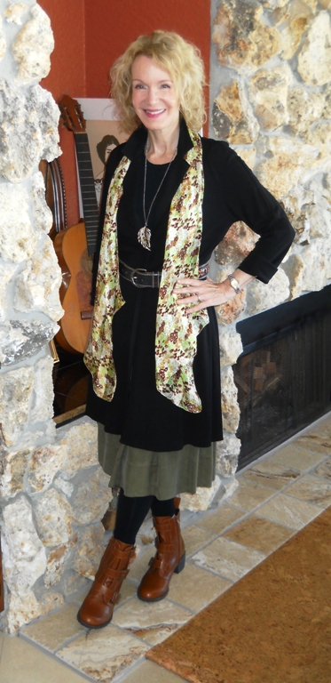I like it with the scarf – it helps tie in the brown of the boots and the olive in the skirt. Looking lovely, Patti!